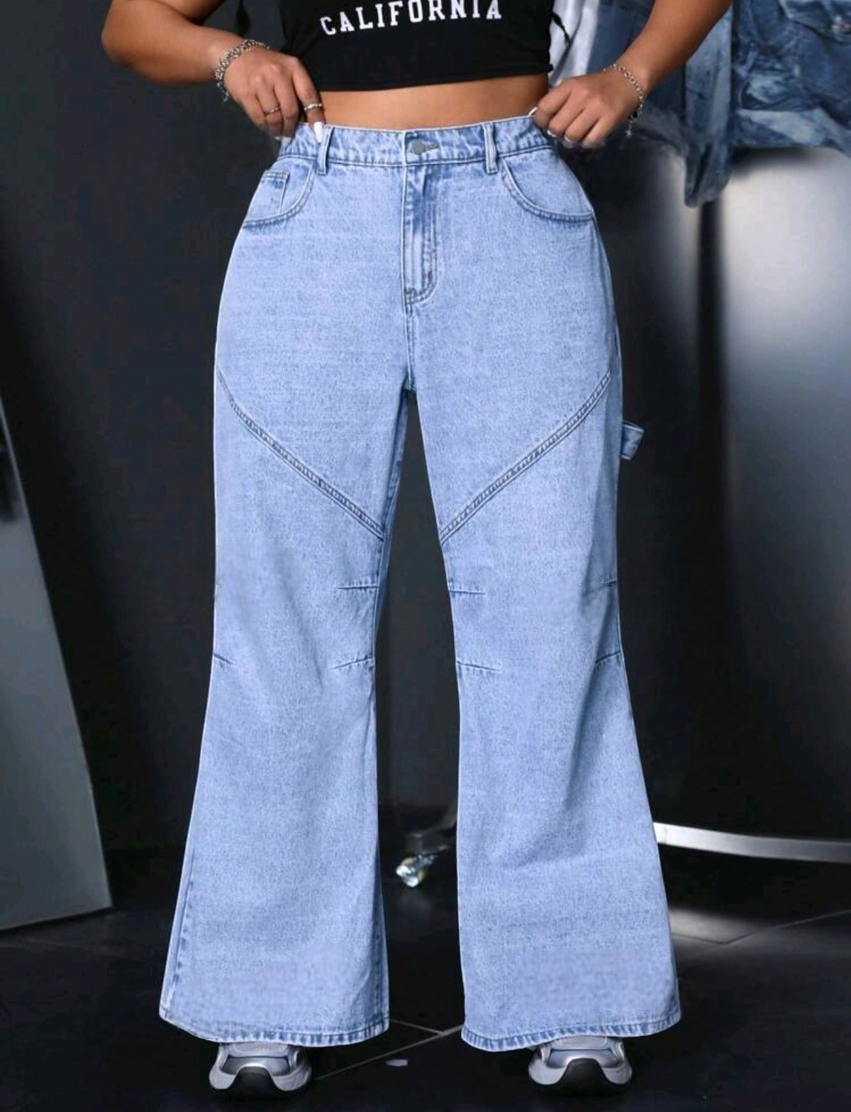¡Te presentamos nuestro nuevo modelo de jeans tipo bota campana holgado en un encantador color claro con un sutil desgaste! Este jean se distingue por su estilo de costuras en los muslos, su talle alto y un ajuste perfecto en la cintura, todo asegurando un look impecable.