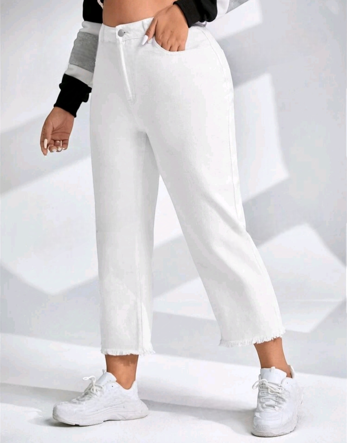 Optar por un color blanco sin desgarros ni rotos añade un toque de frescura y elegancia atemporal al conjunto. Este tipo de pantalones es versátil, ya que puede combinarse fácilmente con una variedad de tops y calzado, adaptándose tanto a ocasiones casuales como a eventos más formales, dependiendo de cómo se complemente el outfit.