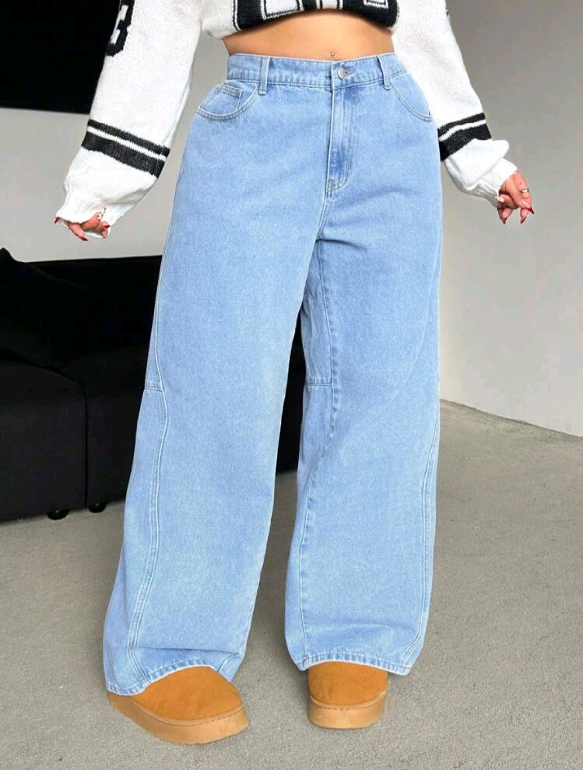 Estilo y comodidad en una sola prenda. Este jean de pierna ancha en tono azul claro es perfecto para crear looks elegantes, sobrios y relajados pero con mucha actitud. Su diseño de cintura alta con elástico posterior garantiza un ajuste cómodo y favorecedor, mientras que el corte holgado aporta libertad de movimiento y un aire moderno.