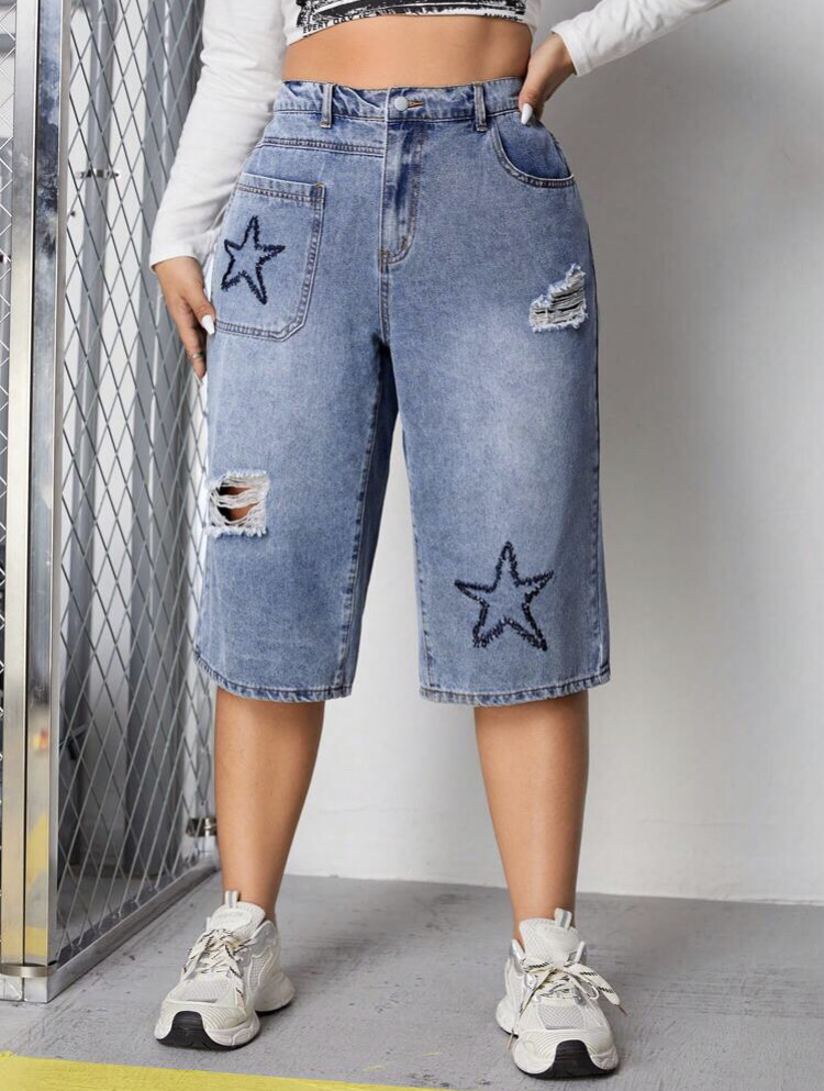 Short en jean rigido tipo bermuda, muy bonito desgaste y desgarros, detalle de estrellas bordadas corte de contorno ajustado gracias a su cintura con elástico moldeador, con botón y cremallera delantera. Una pieza recomendada al 100%.