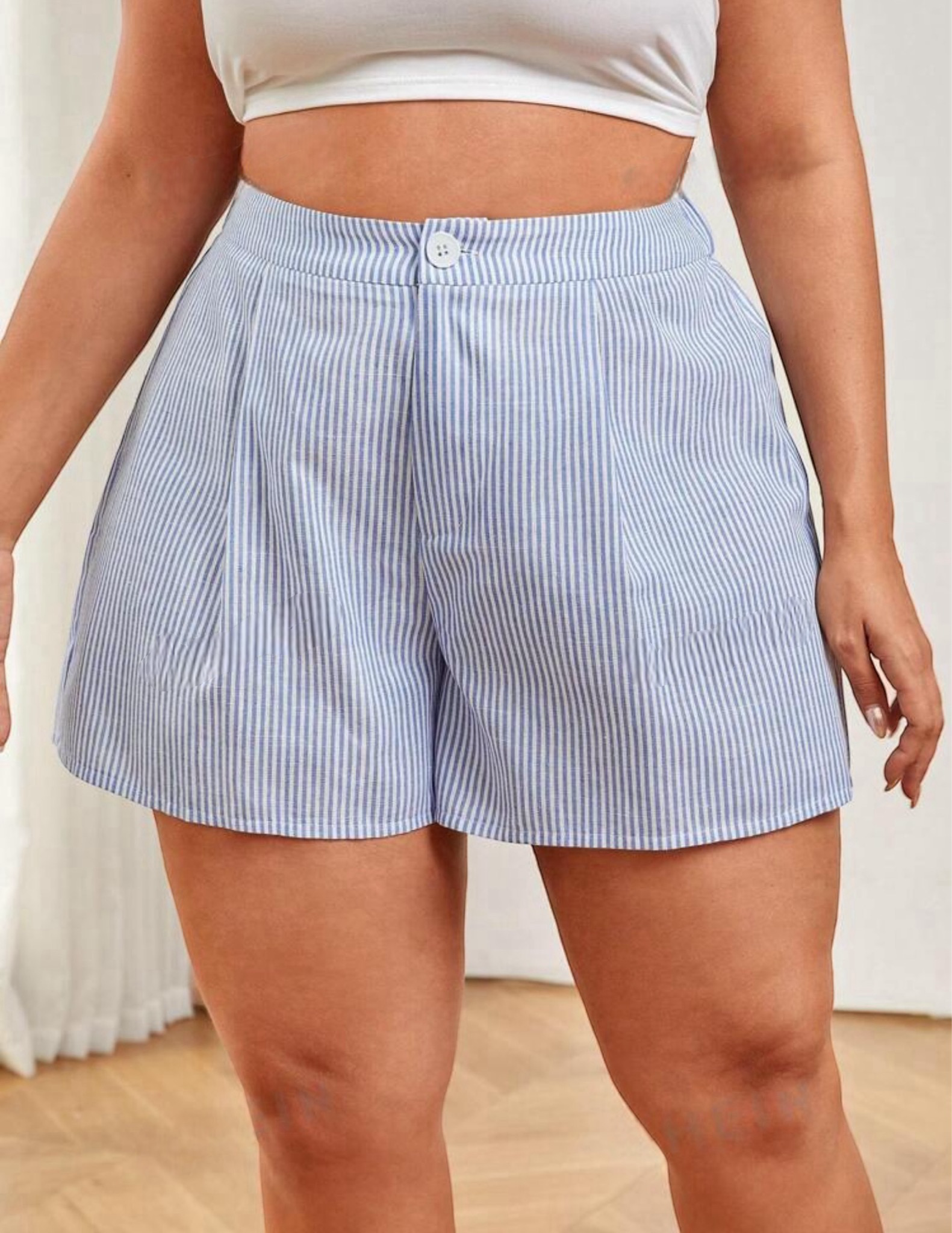 El patrón de rayas en color azul añade un toque de estilo y sofisticación al short, proporcionando un contraste agradable y versátil que puede combinarse fácilmente con diferentes partes superiores y accesorios. El elástico en la cintura junto con el botón en el frente no solo aseguran un ajuste cómodo y seguro, sino que también añaden detalles que realzan el diseño y lo hacen más atractivo visualmente.