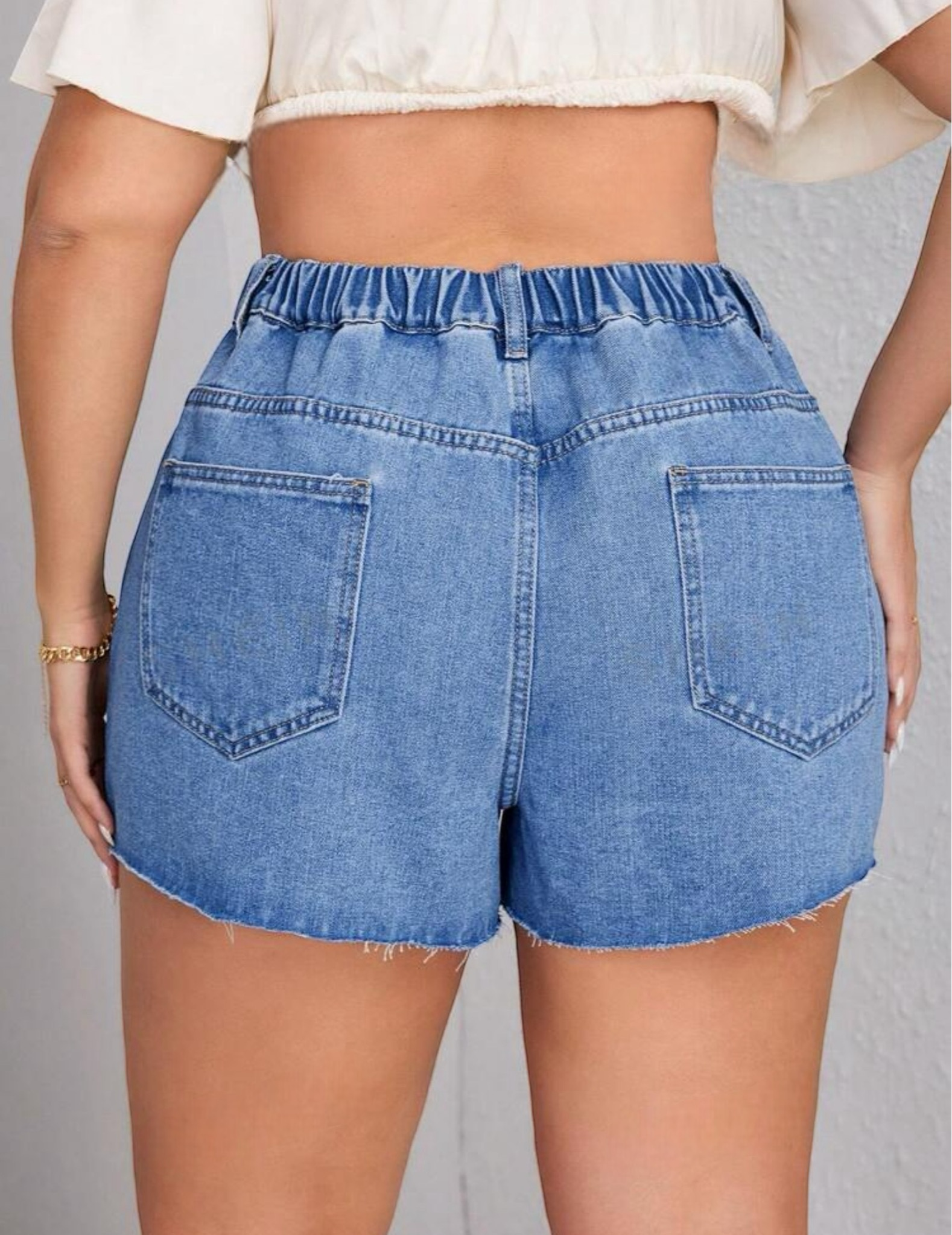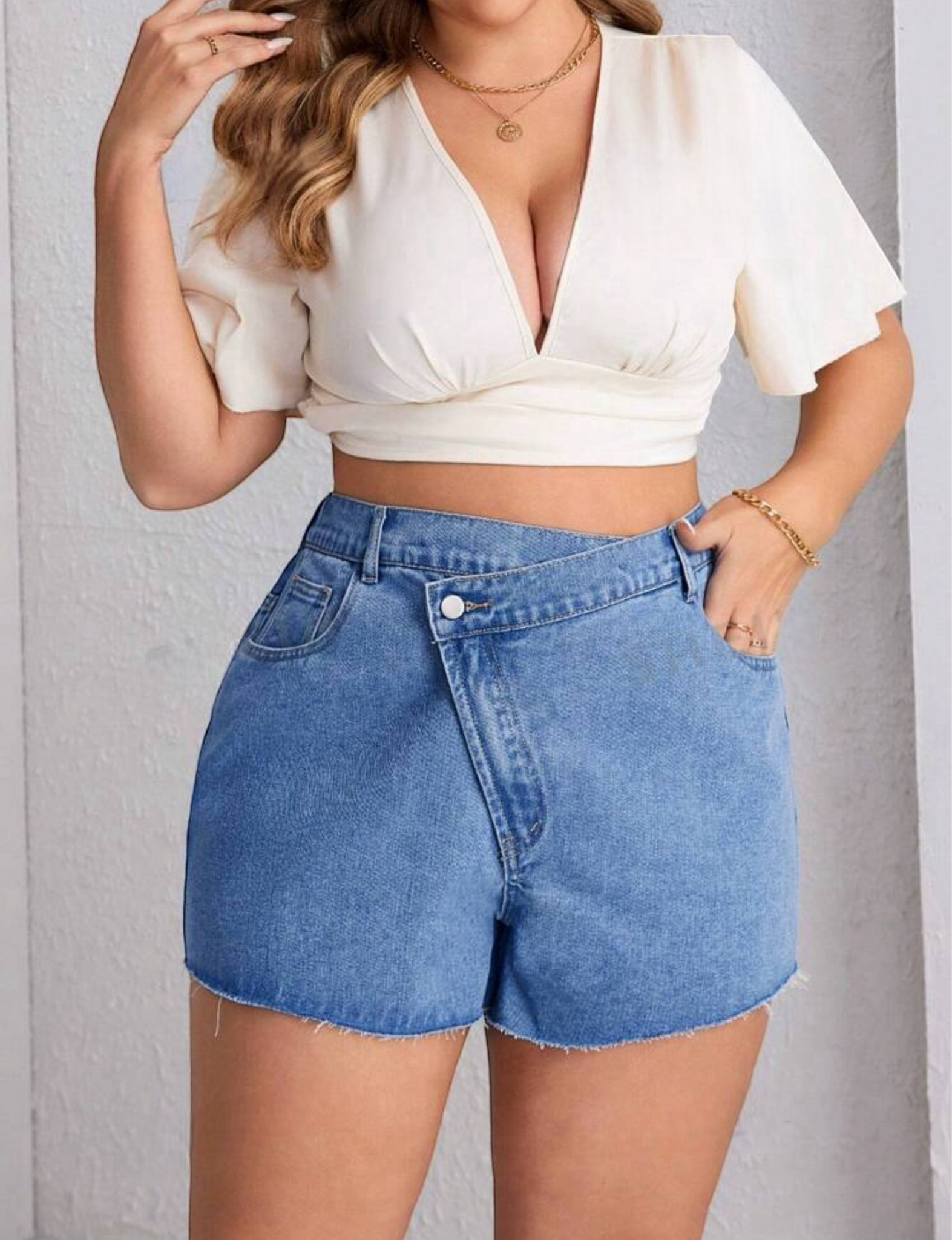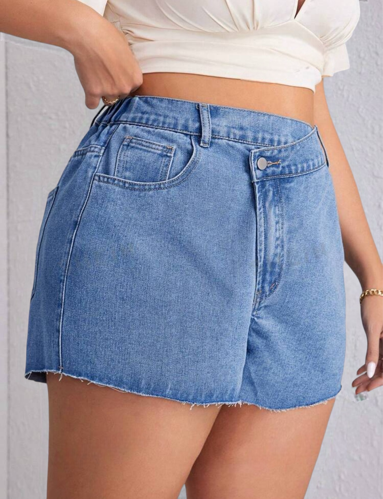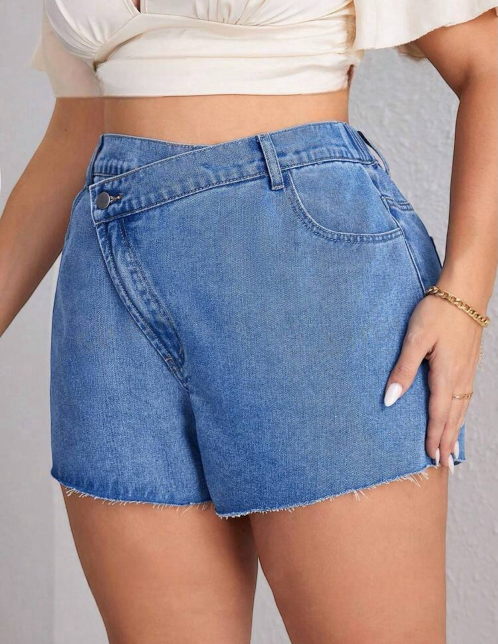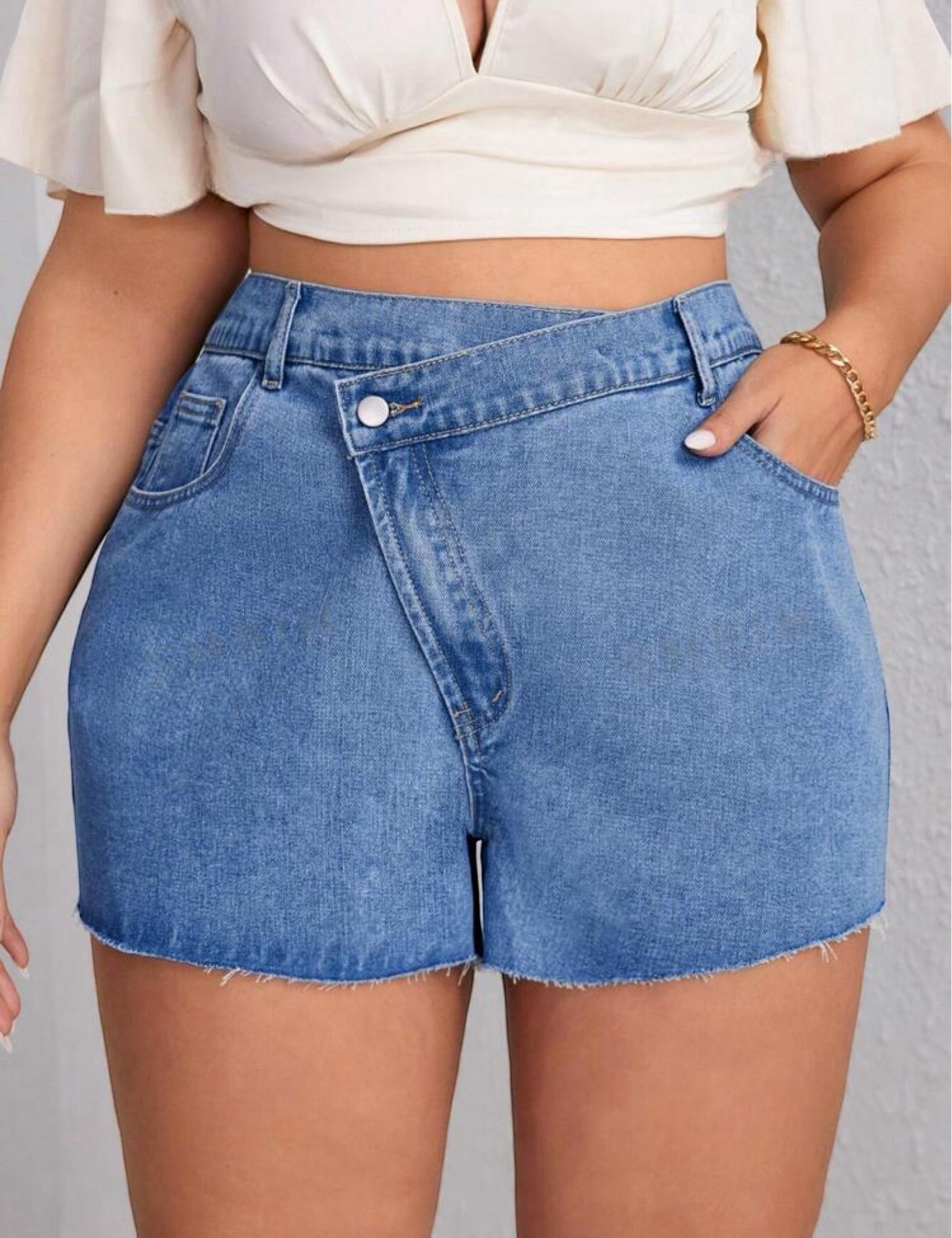 Short en jean rígido liviano con un muy bonito desflecado en puntas, diseño de tono medio y caucho trasero para una horma más ajustada, frente asimétrico con detalle de botón cruzado. Una pieza recomendada al 100%.
